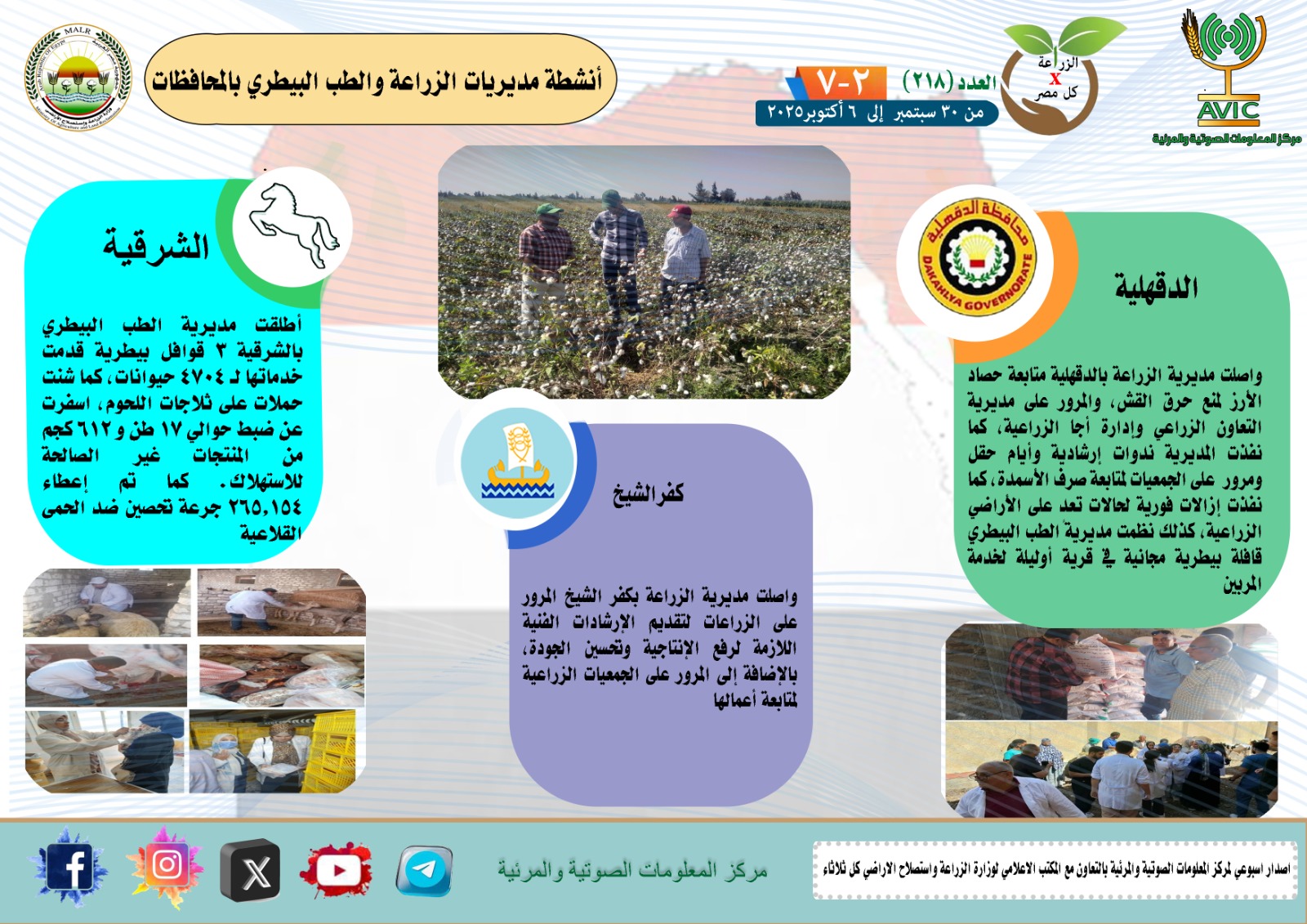 وواصلت مديرية الزراعة بالدقهلية متابعة حصاد الأرز لمنع حرق القش، والمرور على مديرية التعاون الزراعي وإدارة أجا الزراعية، كما نفذت المديرية ندوات إرشادية وأيام حقل ومروراً على الجمعيات لمتابعة صرف الأسمدة، كما نفذت إزالات فورية لحالات تعدٍ على الأراضي الزراعية، كذلك نظمت مديرية الطب البيطري قافلة بيطرية مجانية في قرية أوليلة لخدمة المربين، كما أطلقت مديرية الطب البيطري بالشرقية 3 قوافل بيطرية قدمت خدماتها لـ 4704 حيوانات، كما شنت حملات على ثلاجات اللحوم، اسفرت عن ضبط حوالي 17 طن و 612 كجم من المنتجات غير الصالحة للاستهلاك. كما تم إعطاء 265,154 جرعة تحصين ضد الحمى القلاعية.