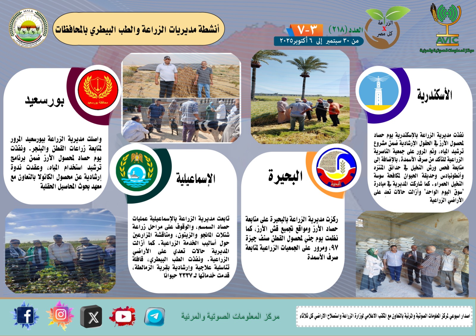 بينما ركزت مديرية الزراعة بالبحيرة على متابعة حصاد الأرز ومواقع تجميع قش الأرز، كما نظمت يوم جني لمحصول القطن صنف جيزة 97، ومروراً على الجمعيات الزراعية لمتابعة صرف الأسمدة، كما نفذت مديرية الزراعة بالإسكندرية يوم حصاد لمحصول الأرز في الحقول الإرشادية ضمن مشروع ترشيد المياه، وتم المرور على جمعية الناصرية الزراعية للتأكد من صرف الأسمدة، بالإضافة إلى متابعة فحص ورش النخيل في حدائق المنتزه وأنطونيادس وحديقة الحيوان لمكافحة سوسة النخيل الحمراء. كما شاركت المديرية في مبادرة “سوق اليوم الواحد” وأزالت حالات تعدٍ على الأراضي الزراعية.