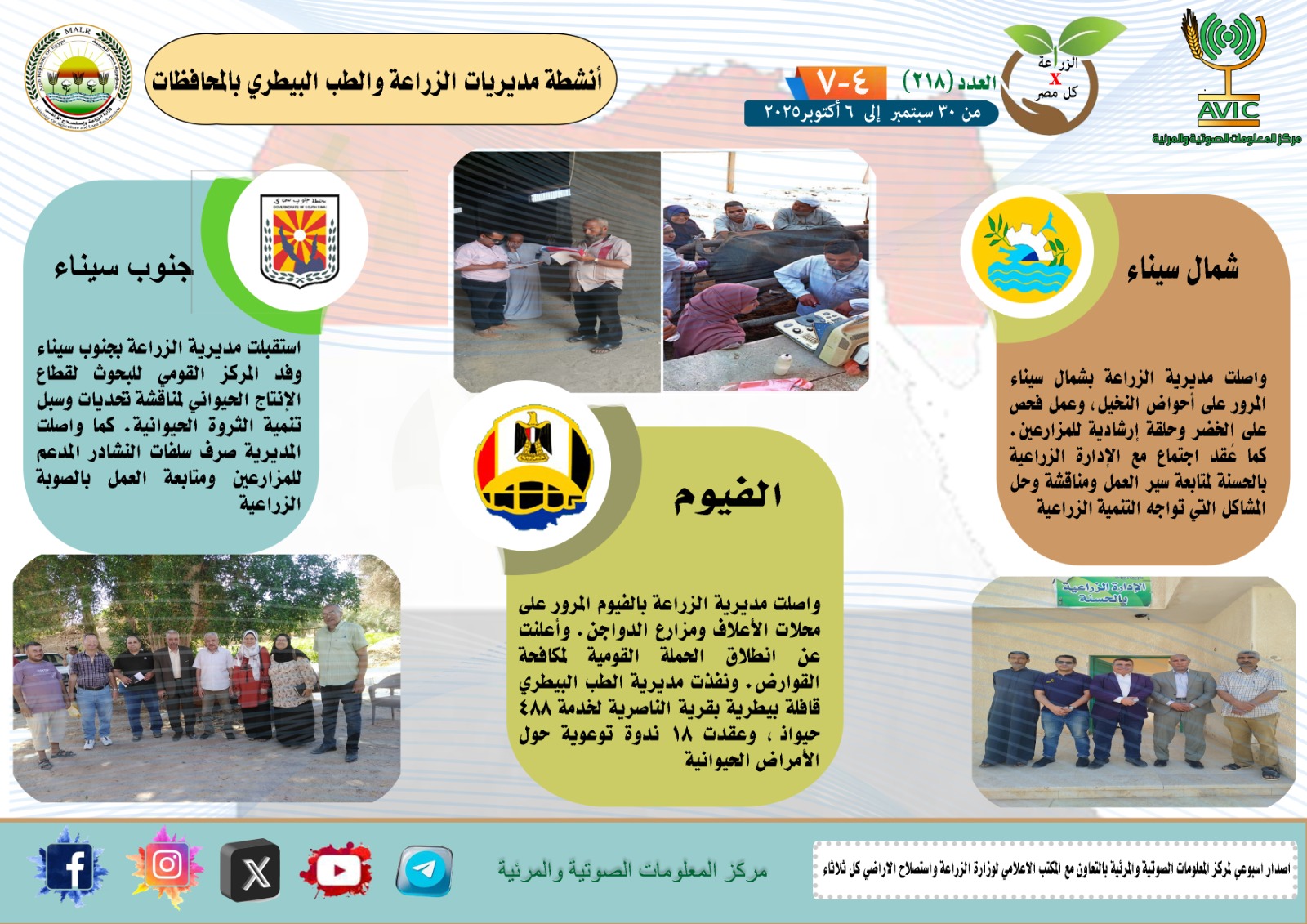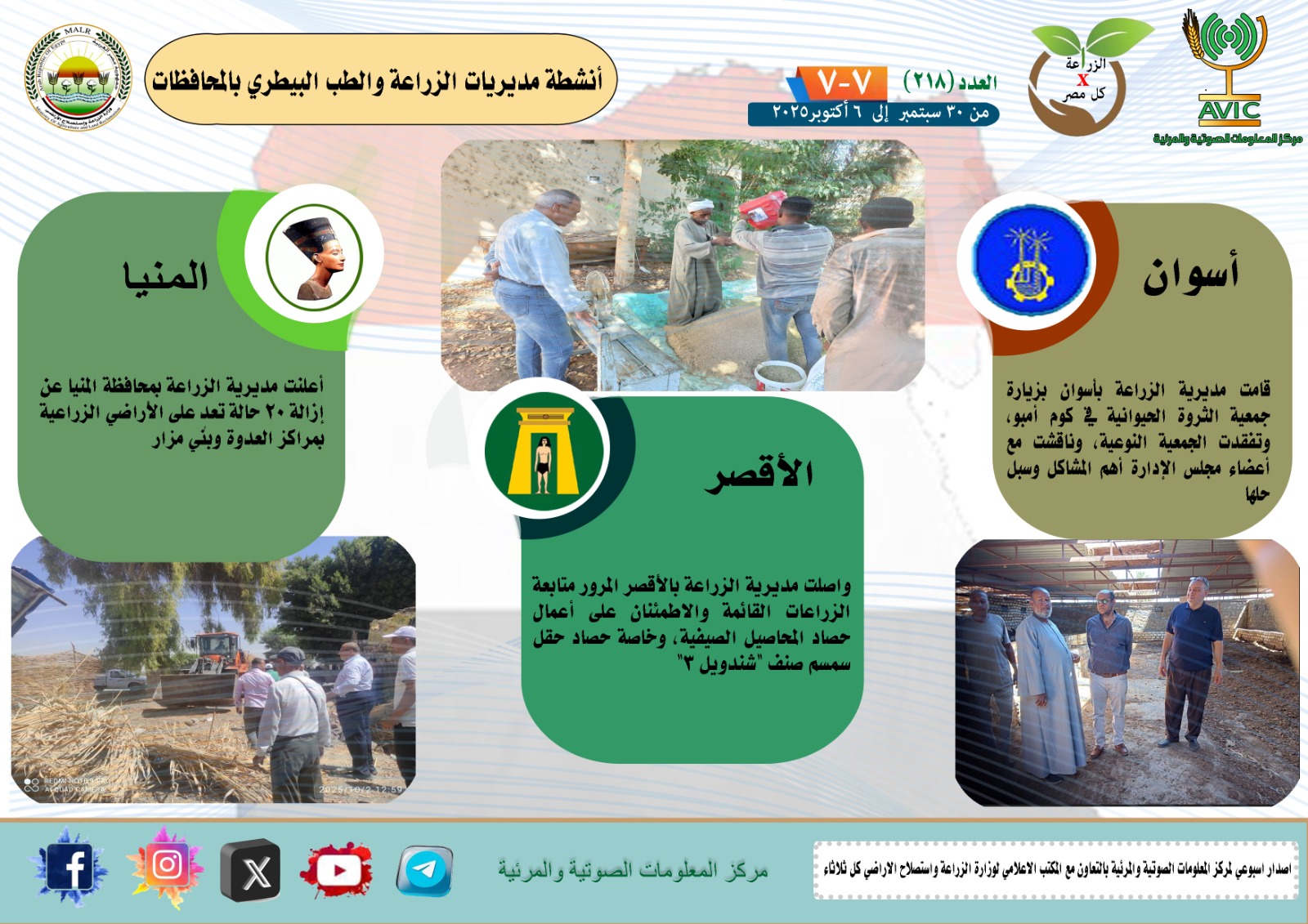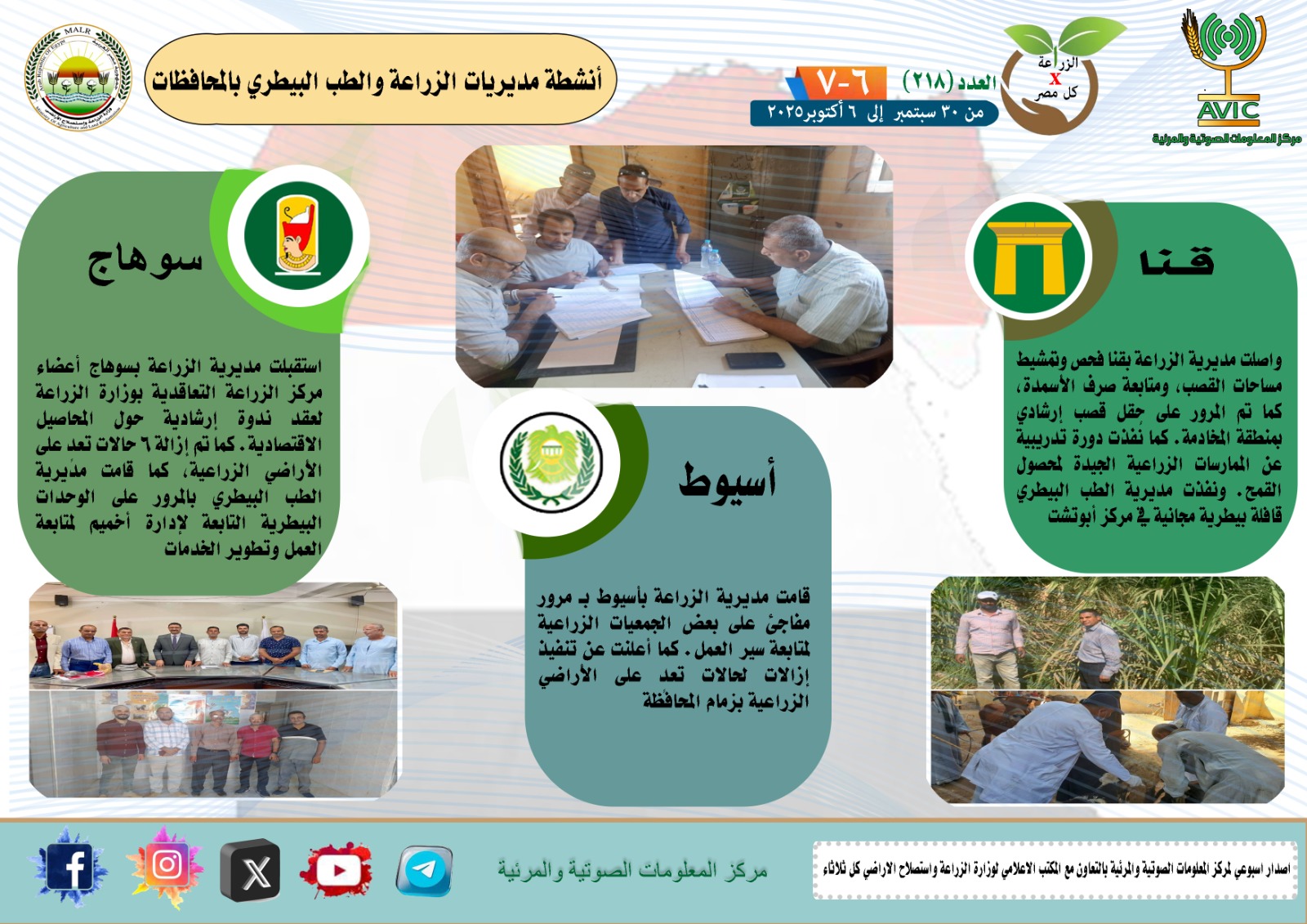 أصدر مركز المعلومات الصوتية والمرئية التابع لوزارة الزراعة واستصلاح الأراضي، والمكتب الاعلامي للوزارة، العدد رقم 218 من اصدار: “الزراعة في كل مصر” بالانفوجراف والفيديو، يوضح الجهود والانشطة التي تقوم بها مديريات الزراعة والطب البيطري بمحافظات الجمهورية خلال الفترة من 30 سبتمبر إلى 6 اكتوبر الجاري