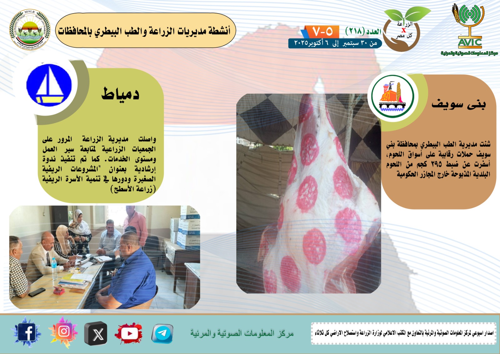 وخلال هذا الاسبوع نفذت مديرية الطب البيطري بالقاهرة ندوات توعوية حول الأمراض المشتركة ومرض السعار، كما أسفرت حملات المديرية على الأسواق عن ضبط كمية كبيرة بلغت 25.5 طن من اللحوم والدواجن والأسماك غير الصالحة للاستهلاك الآدمي، كما واصلت مديرية الزراعة بالجيزة المرور والمتابعة للجمعيات الزراعية ومنظومة صرف الأسمدة الصيفية المدعمة، كما أزالت 15 حالة تعدٍ على الأراضي الزراعية، كذلك نفذت مديرية الطب البيطري قافلة بيطرية مجانية بالبدرشين لعلاج ورش وتجريع 3944 رأس ماشية وعقدت ندوات إرشادية. كما شنت حملات رقابية أسفرت عن ضبط أكثر من 5.6 طن من اللحوم المصنعة والدواجن غير الصالحة، ونجحت المديرية في تحصين 220,319 رأس ماشية ضد الحمى القلاعية.