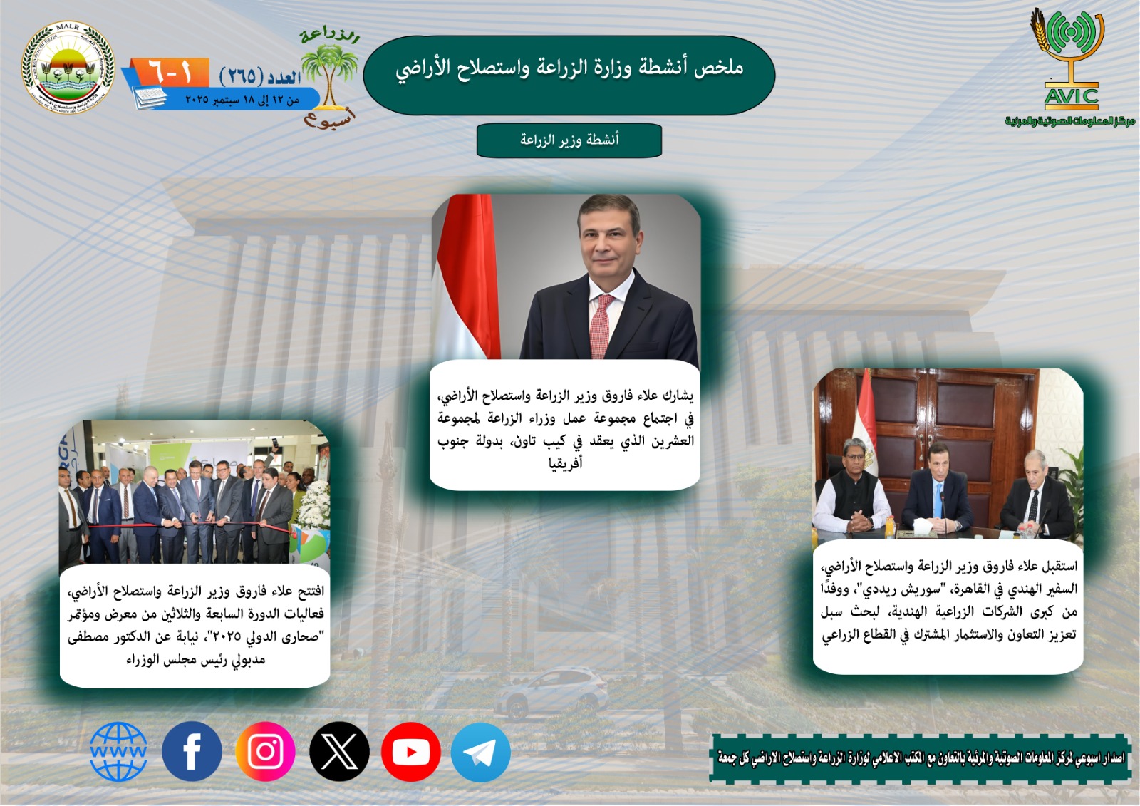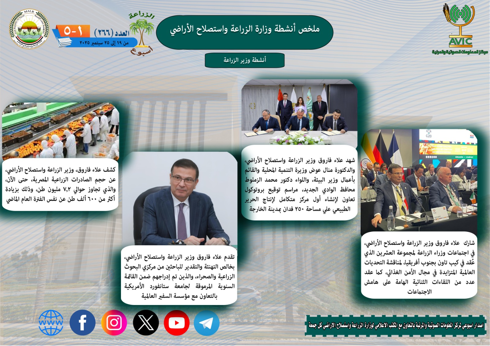 أصدر مركز المعلومات الصوتية والمرئية، التابع لوزارة الزراعة واستصلاح الاراضي، “الانفوجراف الاسبوعي” في نسخته رقم ١٣٣ ،  حول الحصاد الاسبوعي لأهم أنشطة الوزارة، خلال الاسبوع الماضي في الفترة   من ٤ وحتى ٩ مارس الجاري، وذلك بالتعاون مع المكتب الاعلامي للوزارة، كما أصدر المركز ايضا ملخصا بالفيديو، حول انشطة الوزارة خلال نفس الفترة.