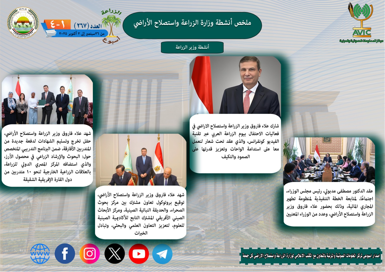 وزير الزراعة في مؤتمر "الزراعة والغذاء": الدولة المصرية حققت طفرة غير مسبوقة في التنمية المستدامة وزير الزراعة يشارك في افتتاح فعاليات النسخة الثامنة من أسبوع القاهرة للمياه بحضور نائب رئيس الوزراء ووزير قطاع الأعمال ومحافظ القليوبية.. وزير الزراعة يشهد حفل تخرج الدفعة الأو... "الزراعة" تكثّف جهود الرعاية التناسلية والتحسين الوراثي للماشية خلال سبتمبر وزير الزراعة يطلق خطة شاملة استعدادا لموسم زراعة القمح: توفير مستلزمات الإنتاج والإرشاد الزراعي وال... وزير الزراعة يؤكد دعم مصر الدائم للأشقاء من دول القارة السمراء.. وفد "منتدى الأرز الأفريقي" يزور "طنطا موتورز" للوقوف على أحدث تقنيات زراعة وحصاد الأرز بدعوة من "علاء فاروق".. وفود منتدى الأرز الأفريقي تتفقد محطة سخا للاطلاع على أحدث تقنيات زراعة الأرز "بحوث الصحراء" يختتم فعاليات الدورة السابعة للمدرسة الصيفية بمطروح بنتائج بحثية وشراكات أكاديمية بحوث الصحراء وجامعة مطروح يوقعان برتوكول تعاون لدعم البحث العلمي والتنمية المستدامة