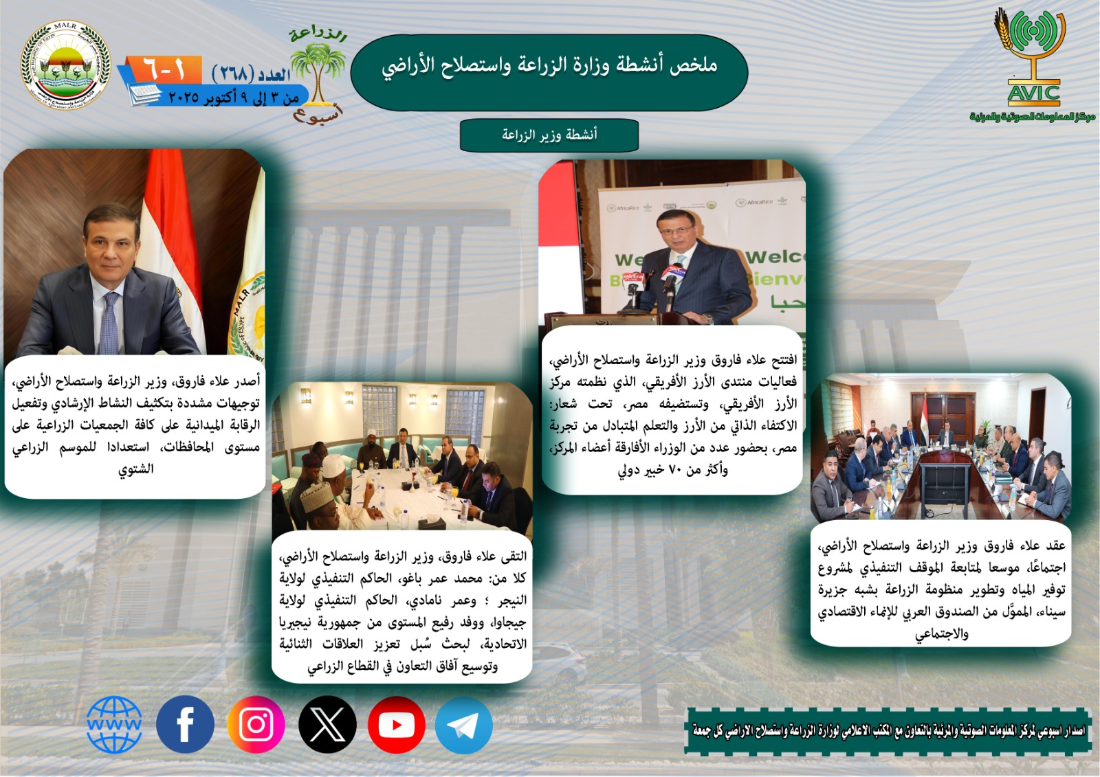 يذكر ان مركز المعلومات الصوتية والمرئية، والمكتب الاعلامي للوزارة، يصدران الجمعة من كل اسبوع، انفوجرافا وفيديو باسم: الزراعة في اسبوع، لالقاء الضوء على ملخص ما تم من انشطة وجهود، بكافة القطاعات والهيئات، التابعة للوزارة، فضلا عن انفوجراف وفيديو كل ثلاثاء باسم: الزراعة في كل مصر، حول انشطة وجهود القطاع الزراعي، بالمحافظات المختلفة، كما أصدر المركز مؤخرا، سلسلة دليل خدمات وزارة الزراعة واستصلاح الأراضي، والذي يلقي الضوء على الخدمات التي تقدمها الوزارة للمزارع والمربي، كذلك اصدار ارقام في الزراعة، الذي يلقى الضوء على انجازات القطاع الزراعي بالارقام، فضلا عن إصداره الاخير MALR مجلة وزارة الزراعة واستصلاح الأراضي ، الالكترونية الشهرية، الزراعية المتخصصة الاخبارية والمتنوعة.