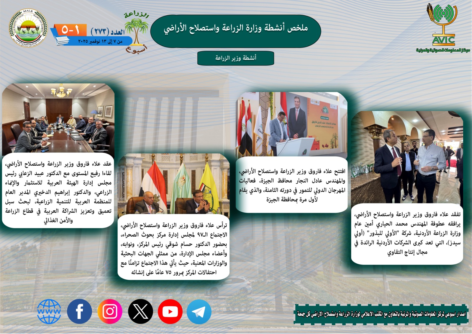 أصدر مركز المعلومات الصوتية والمرئية، التابع لوزارة الزراعة واستصلاح الاراضي، “الانفوجراف الاسبوعي” في نسخته رقم ١٤٠ ، حول الحصاد الاسبوعي لأهم أنشطة الوزارة، خلال الاسبوع الماضي في الفترة من ٢١ وحتى ٢٧ ابريل الجاري، وذلك بالتعاون مع المكتب الاعلامي للوزارة، كما أصدر المركز ايضا ملخصا بالفيديو، حول انشطة الوزارة خلال نفس الفترة.