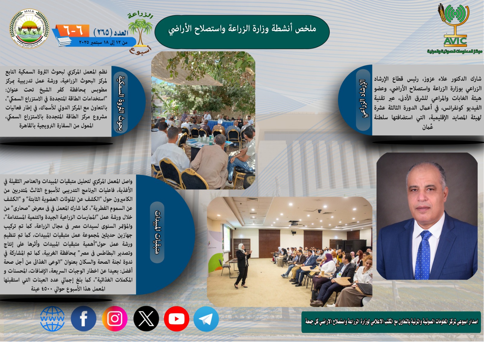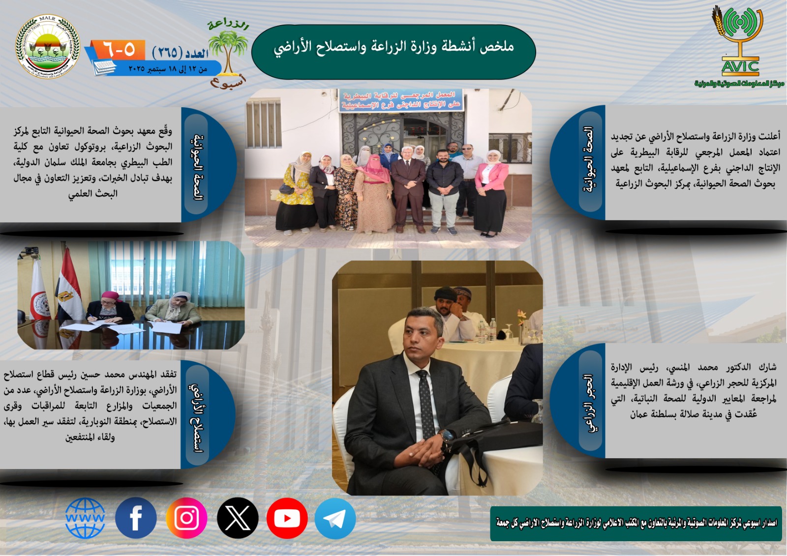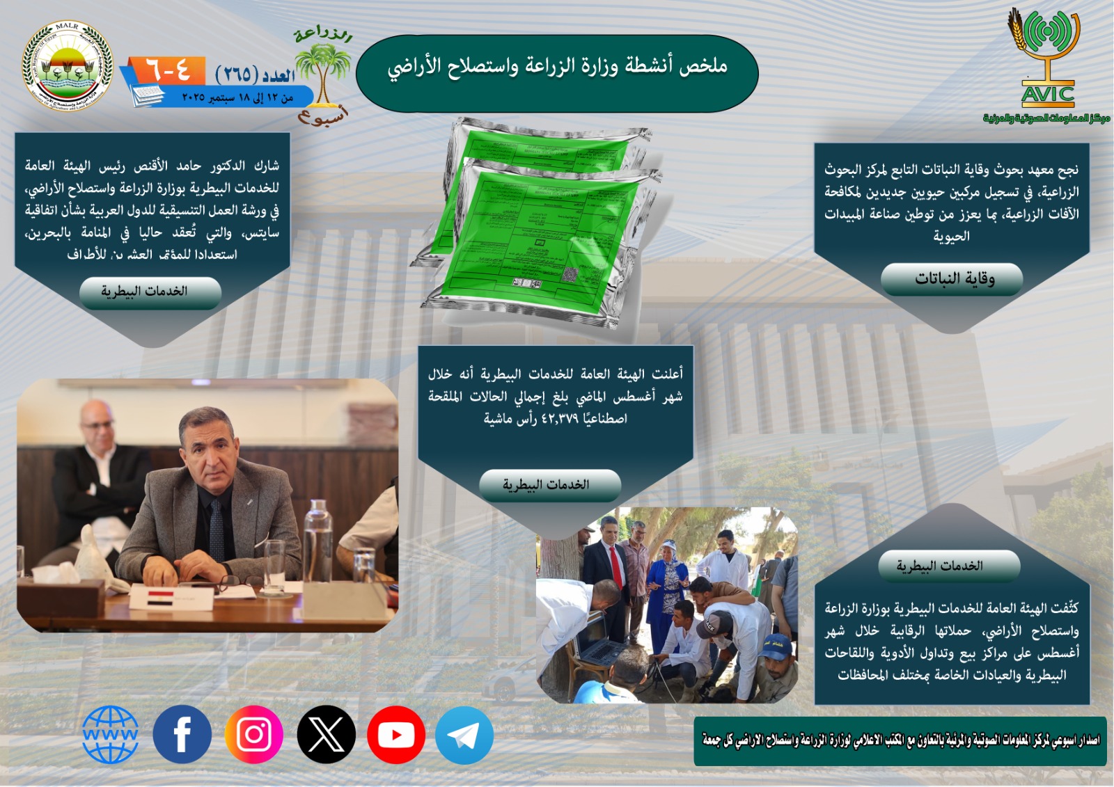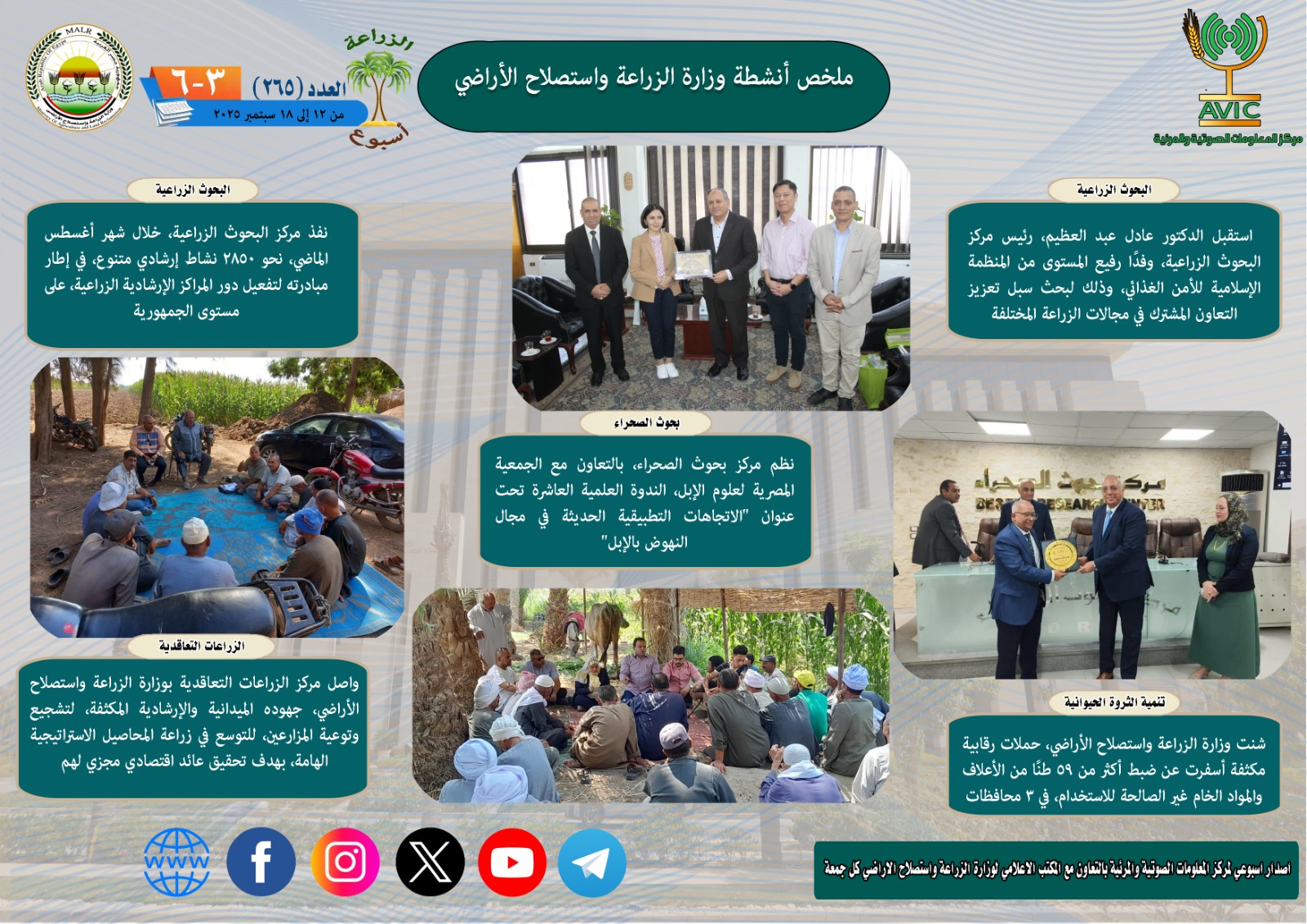 يذكر ان مركز المعلومات الصوتية والمرئية، والمكتب الاعلامي للوزارة، يصدران الجمعة من كل اسبوع، انفوجرافا وفيديو باسم: الزراعة في اسبوع، لالقاء الضوء على ملخص ما تم من انشطة وجهود، بكافة القطاعات والهيئات، التابعة للوزارة، فضلا عن انفوجراف وفيديو كل ثلاثاء باسم: الزراعة في كل مصر، حول انشطة وجهود القطاع الزراعي، بالمحافظات المختلفة.