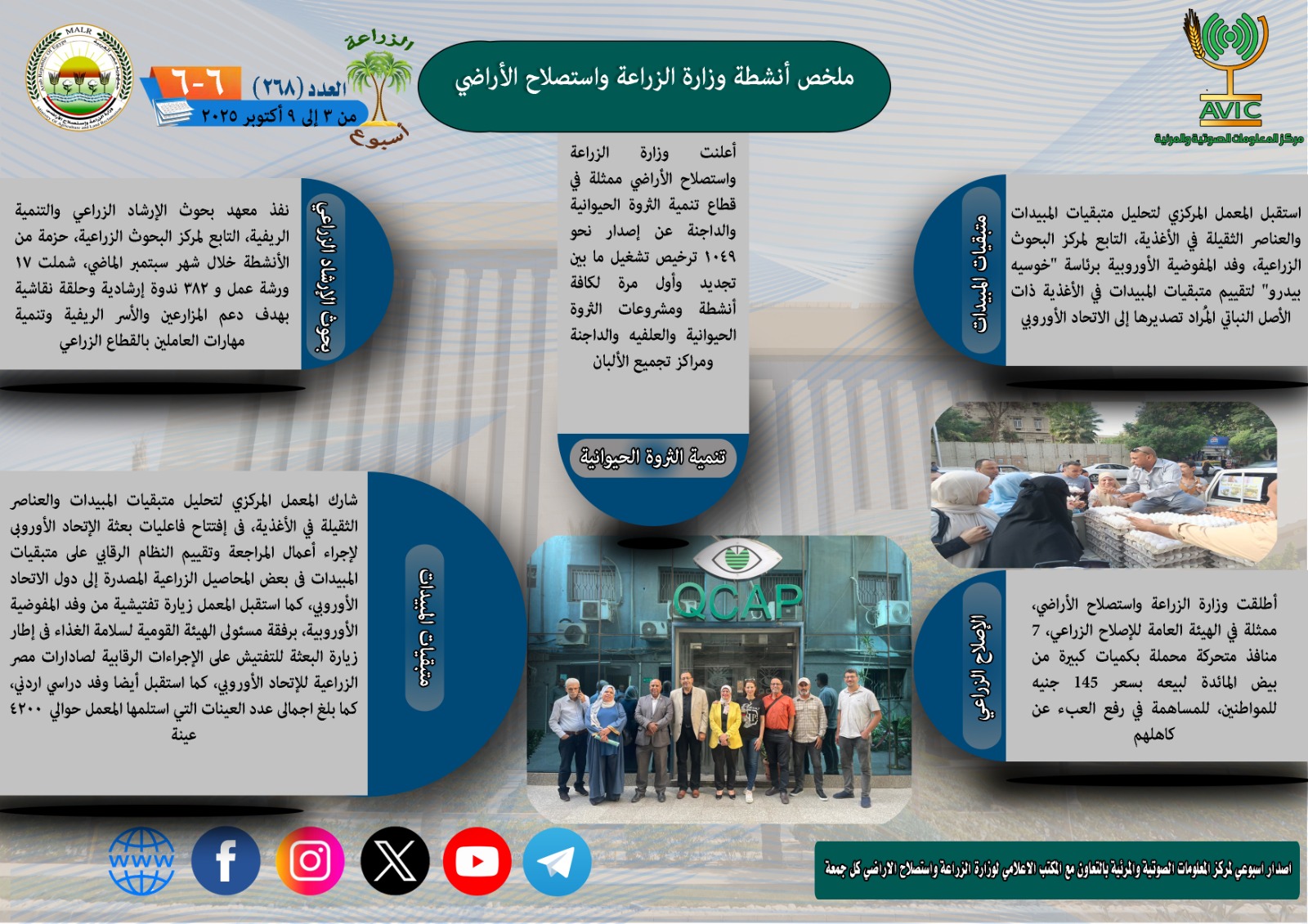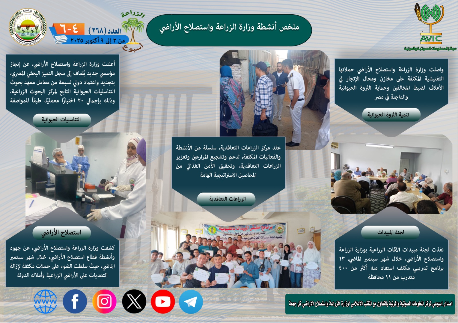 أصدر مركز المعلومات الصوتية والمرئية بوزارة الزراعة واستصلاح الأراضي، “الانفوجراف الاسبوعي” في نسخته رقم 268 حول الحصاد الاسبوعي لأهم أنشطة الوزارة، خلال الاسبوع الماضي في الفترة من 3 وحتى 9 أكتوبر الجاري، كما أصدر المركز ايضا ملخصا بالفيديو، حول انشطة الوزارة خلال نفس الفترة.