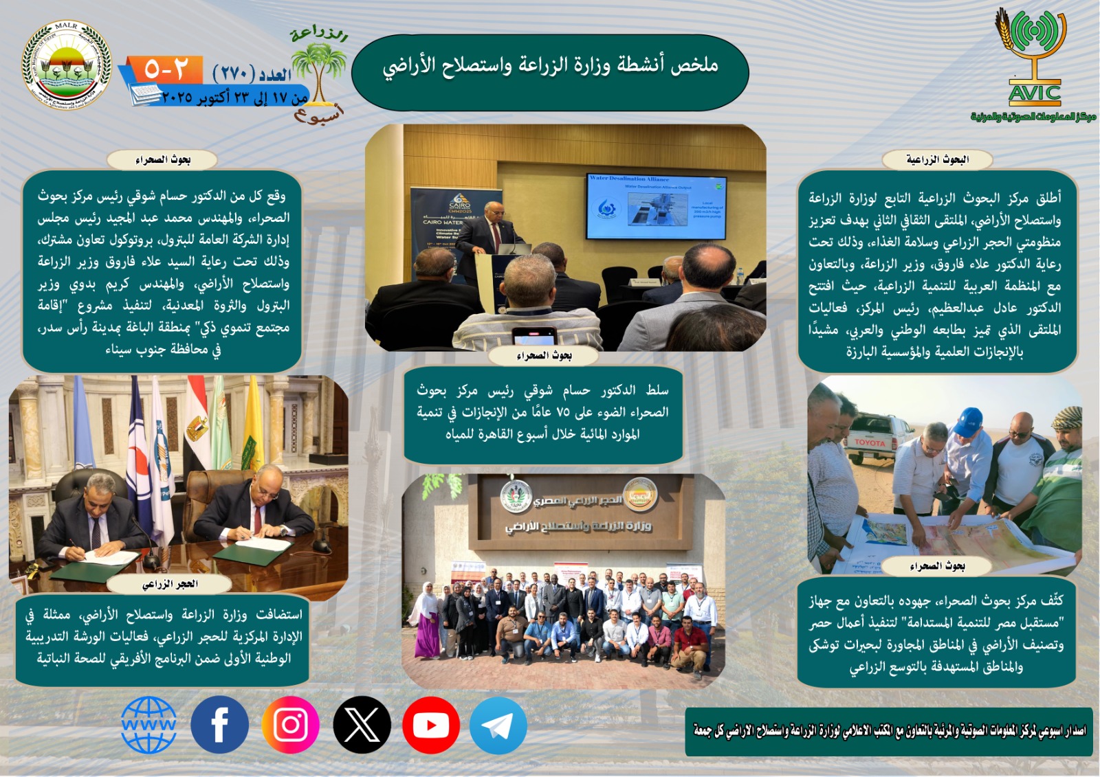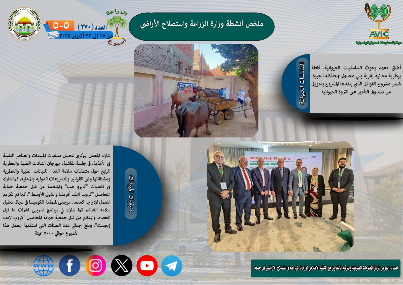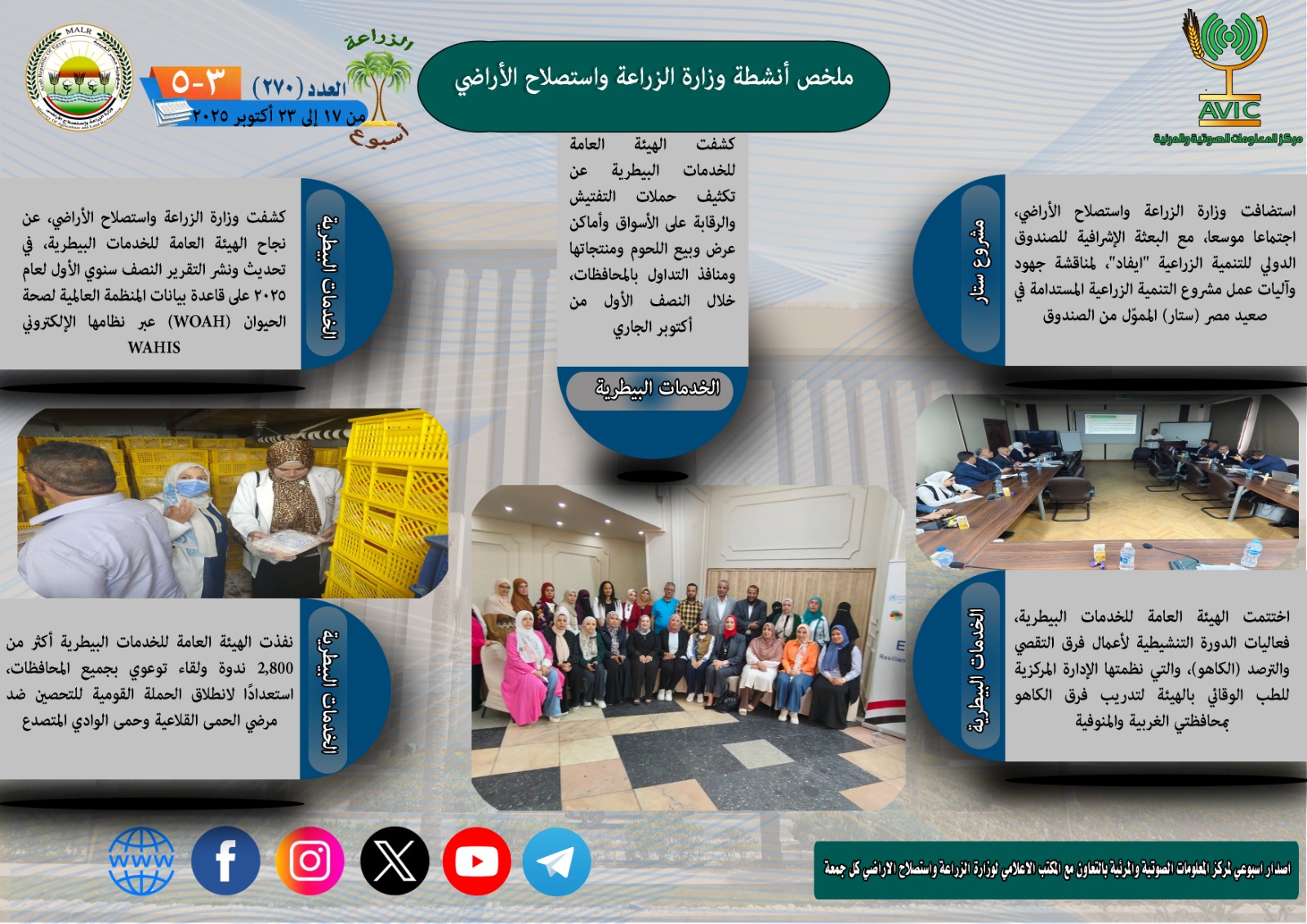أصدر مركز المعلومات الصوتية والمرئية بوزارة الزراعة واستصلاح الأراضي، “الانفوجراف الاسبوعي” في نسخته رقم 270 حول الحصاد الاسبوعي لأهم أنشطة الوزارة، خلال الاسبوع الماضي في الفترة من 17 وحتى 23 أكتوبر الجاري، كما أصدر المركز ايضا ملخصا بالفيديو، حول انشطة الوزارة خلال نفس الفترة.