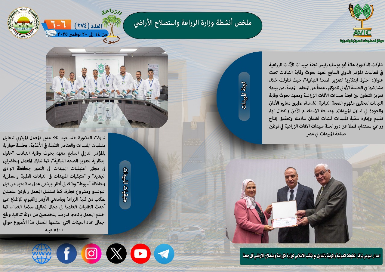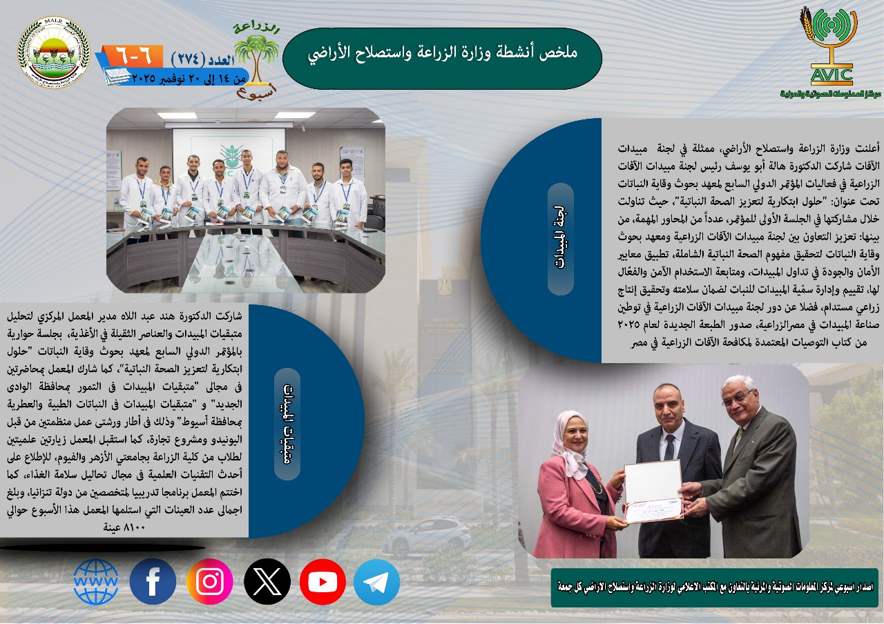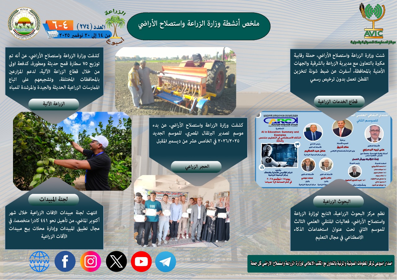 بالانفوجراف والفيديو| “الزراعة في اسبوع” نشرة الحصاد رقم 274 لأنشطة الوزارة في الفترة من 14 وحتى 20 نوفمبر الجاري