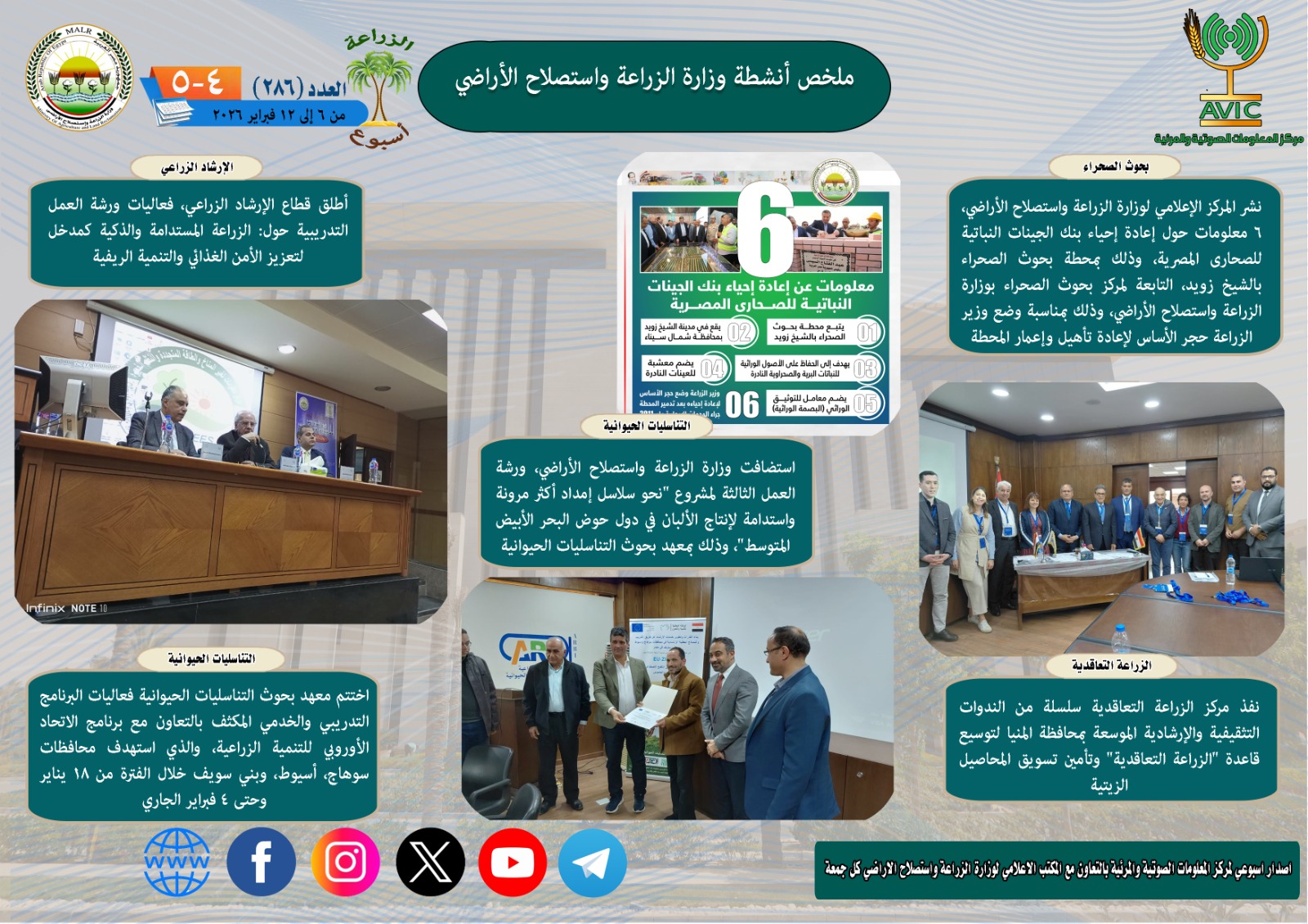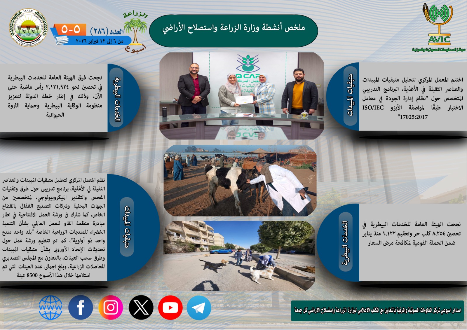 أصدر مركز المعلومات الصوتية والمرئية بوزارة الزراعة واستصلاح الأراضي، “الانفوجراف الاسبوعي” في نسخته رقم 286 حول الحصاد الاسبوعي لأهم أنشطة الوزارة، خلال الاسبوع الماضي في الفترة من 6 وحتى 12 فبراير الجاري، كما أصدر المركز ايضا ملخصا بالفيديو، حول انشطة الوزارة خلال نفس الفترة.