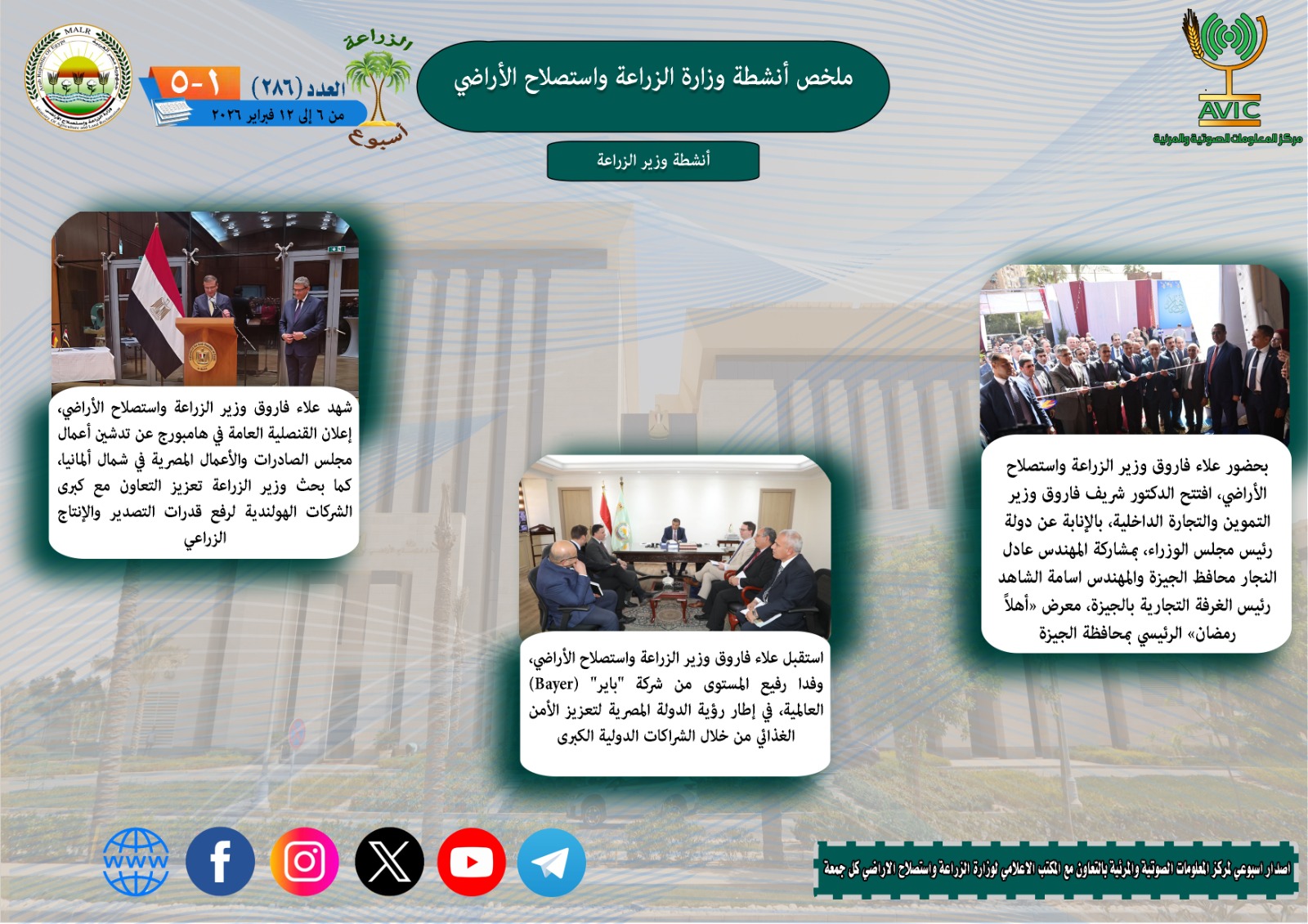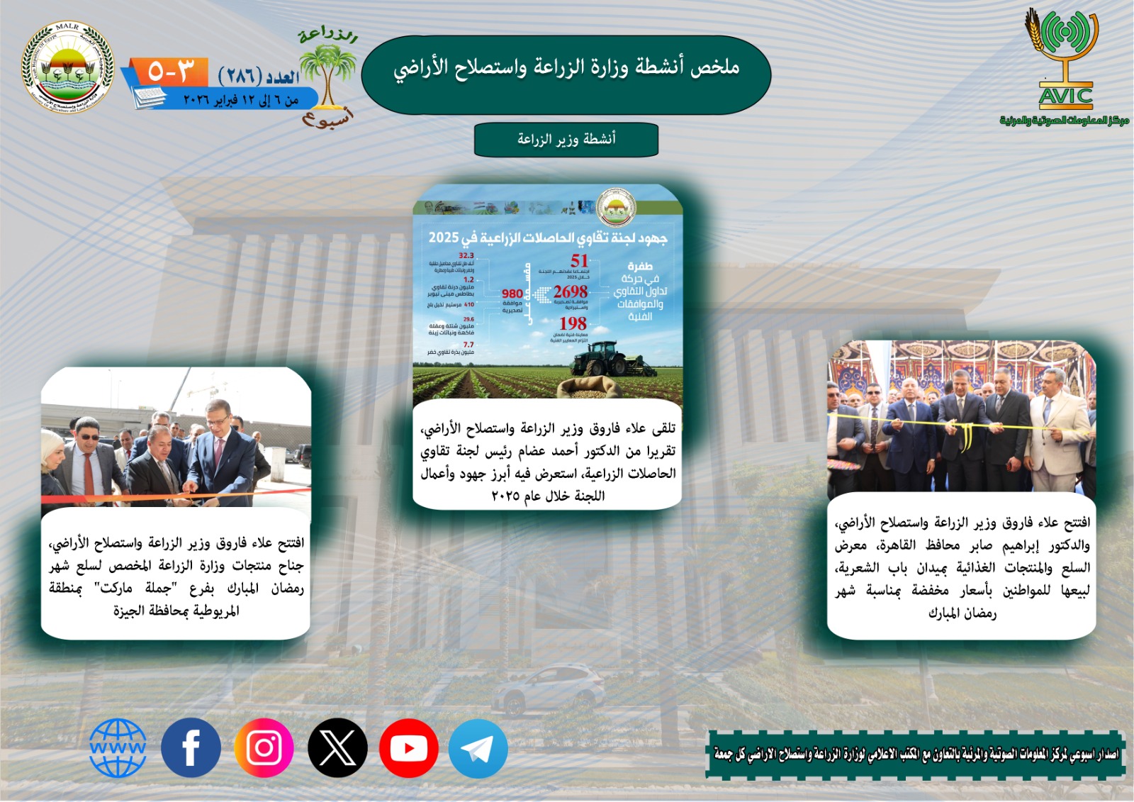 يذكر ان مركز المعلومات الصوتية والمرئية، والمكتب الاعلامي للوزارة، يصدران الجمعة من كل اسبوع، انفوجرافا وفيديو باسم: الزراعة في اسبوع، لالقاء الضوء على ملخص ما تم من انشطة وجهود، بكافة القطاعات والهيئات، التابعة للوزارة.