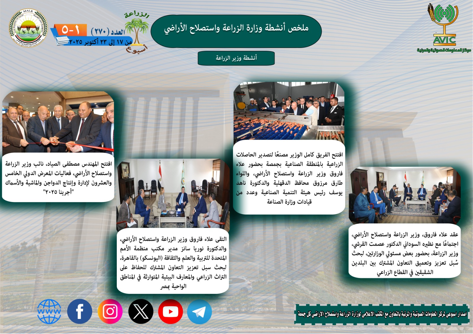 أصدر مركز المعلومات الصوتية والمرئية، التابع لوزارة الزراعة واستصلاح الاراضي، “الانفوجراف الاسبوعي” في نسخته رقم ١٩٦  حول الحصاد الاسبوعي لأهم أنشطة الوزارة، خلال الاسبوع الماضي في الفترة من ١٧ وحتى ٢٣  مايو  الجاري، وذلك بالتعاون مع المكتب الاعلامي للوزارة، كما أصدر المركز ايضا ملخصا بالفيديو، حول انشطة الوزارة خلال نفس الفترة.