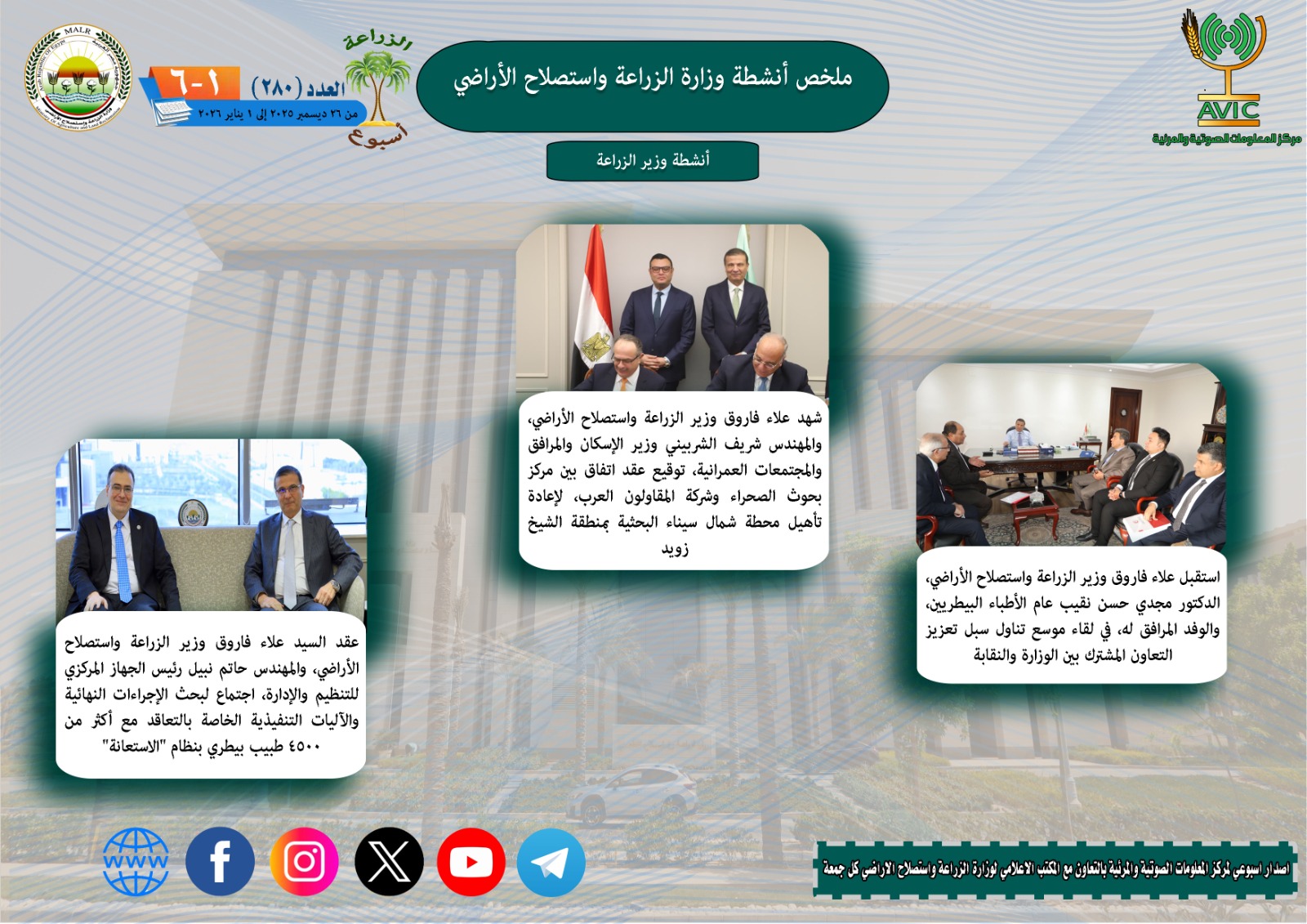 أصدر مركز المعلومات الصوتية والمرئية، التابع لوزارة الزراعة واستصلاح الاراضي، “الانفوجراف الاسبوعي” في نسخته رقم ١٢٠ ، حول الحصاد الاسبوعي لأهم أنشطة الوزارة، خلال الاسبوع الماضي في الفترة من ٢ وحتى ٨ ديسمبر الجاري، وذلك بالتعاون مع المكتب الاعلامي للوزارة، كما أصدر المركز ايضا ملخصا بالفيديو، حول انشطة الوزارة خلال نفس الفترة.